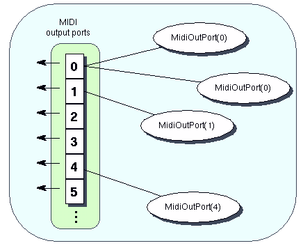 There can be any number of MidiOuputPort instances, each of which directs MIDI output to a common set of MIDI out port locations. The maximum number of hardware ports for the system can be found with the getNumPorts function. Multiple connections of MidiOutPort objects to physical output ports on the computer is demonstrated in Figure 1 below.