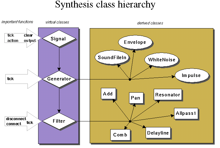 There is no significant difference between the Generator and Filter classes. The Generator class was created solely for didactic purposes. Generator-derived classes are intended to create signals out of the blue, while Filter-derived classes are intended to take in one or more inputs, then output modified signal(s). Also, parameter values can be treated as signals in Filter classes, while in Generator classes, all parameters must be sent to the object as function calls. For example, to start outputing a soundfile signal, the SoundFileIn must be called with the function setFile. Filter classes could act like Generator classes if no upstream connections are made in instances of the Filter-derived class.
