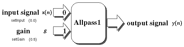 Notice that the input arrows are numbered. This represents the input slot to the Filter class that is being used to connect the signal stream. The input audio signal is entering at slot 0, and the gain parameter for the Allpass1 filter is exptected to come in at slot 1. There are function names in small print underneath the name of each input. The functions describe the default values which will be used if no signal stream is connected at that particular slot. For example in this case, slot 0 will be read as 0.0 if there is no signal connected at slot 0, and likewise, slot 1 will be read as 0.5. Any connections to slots 2 and higher will be ignored by the Allpass1 filter.