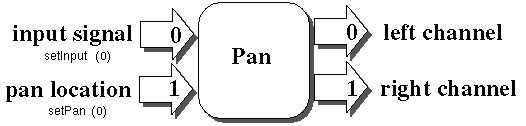 The output in this case is only one signal stream; however, there could be more than one output. If that is the case, then the output channels would be number as was the case for the inputs. Here is an example input/output diagram from the Pan class which contains two outputs: